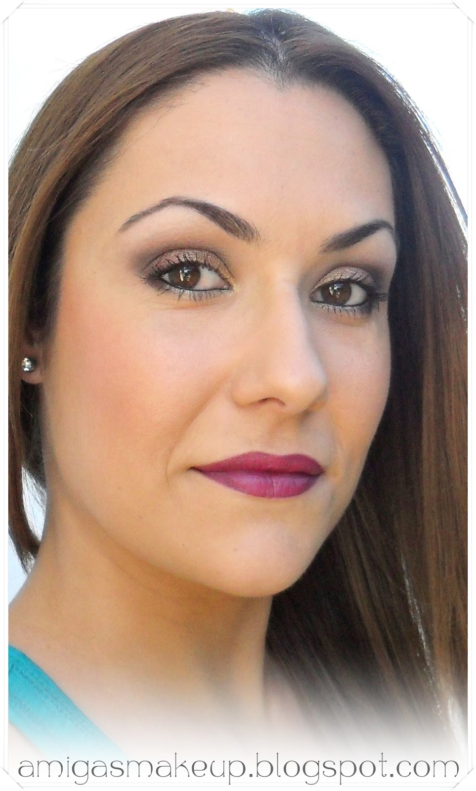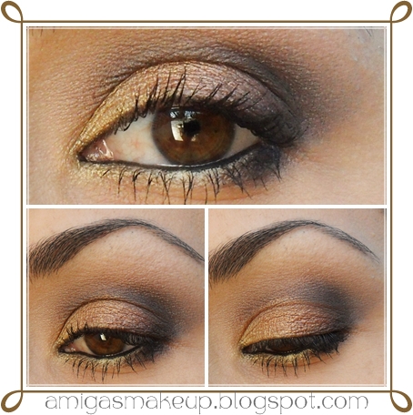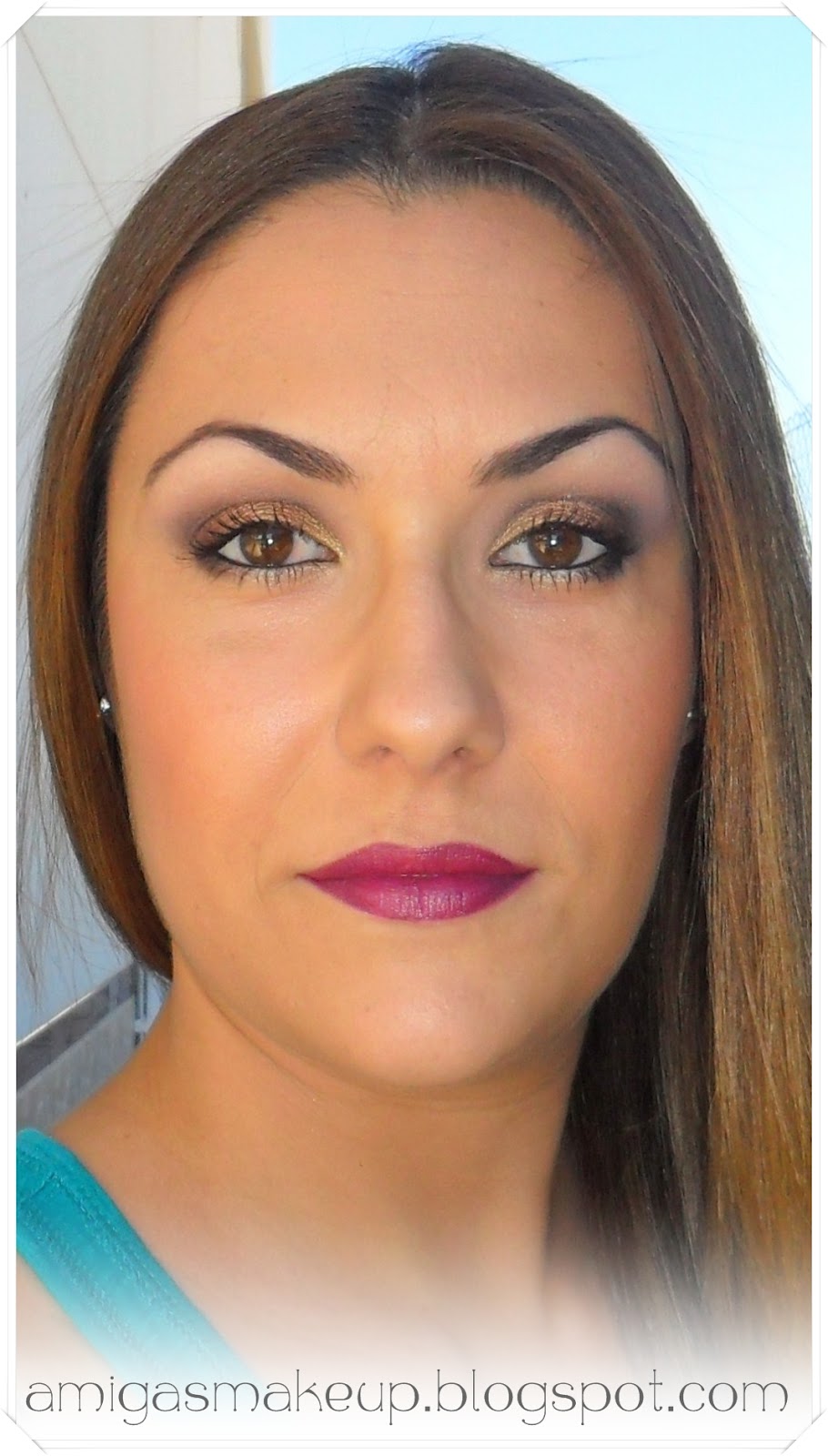 Seguimos con los ojos:Sombra Mono 14 (topo con brillos) desde el lagrimal al centro del párpado móvil y encima de esta aplicamos a toquecitos con un pincel suelto la sombra A003( bronce/dorada). En el último tercio del párpado móvil aplicamos la sombra nº o21 (rojiza) y difuminamos por la cuenca para darle un toque de profundidad. He marcado una V externa con la sombra M4 (negra) y he difuminado bastante bien hasta el centro y encima de ella en el arco de la ceja para igualar un poco el tono he utilizado una sombra blanquecina mate M5.Delineamos la línea de agua con Smokey Eyes negro, con la sombra topo delineamos la parte inferior y con la negra y rojiza la parte exterior con la esponjilla del delineador. Por último aplicamos máscara de pestañas MaXXL.Aplicamos bálsamo labial/fijador y después rellenamos con el delineador 218 y aplicamos el famoso clon del Rebel de Mac, Long Wearing Lisptick L10.Resultado Final