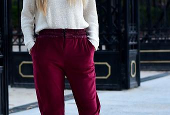 ¡Hola Bonitas! Estos fines de semana más fríos cuando salgo de compras o a comer por el centro de Madrid, busco dos requisitos en el look, que sea cómodo y abrigado. Para esos días me encanta la tendencia de pantalones estilo jogger como este de terciopelo (otra de las tendencias de la temporada) en color burdeos de Bershka. Me parecen monísimos y que tienen mucho estilo tanto para looks formales como informales. Para la parte de arriba uno de esos jerséis suaves y calentitos que tanto me gustan. Aproveché para estrenar mis nuevas sneakers burdeos de XTI que combinaban perfectas con el pantalón y me venían ideales para caminar con comodidad durante varias horas. A este mismo look podemos darle un rollo más formal con un trench y unos tacones si la ocasión lo requiere. Por cierto fuimos a comer al restauranteHarina, frente a la Puerta de Alcalá, un lugar que os recomiendo si no lo conocéis, tiene una estética rustica y sencilla, y es ideal para comer los fines de semana, su menú está genial. ¡Que tengáis una semana estupenda! Un Besazo.
