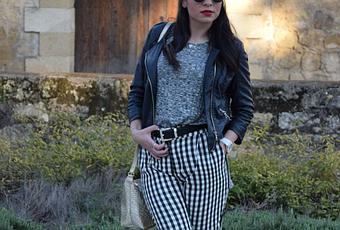 A mí me encanta darle protagonismo a una prenda en concreto del look, en este caso son los pantalones, por su estampado y corte cropped con cintura alta, que tantísimo estamos viendo en las tiendas y nuevas colecciones. Lo he combinado con una camiseta básica en gris y la chaqueta de cuero para completar el outfit.