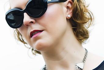 El primer look elegido fue un total look en negro, un rollito setentero, vestido negro, sombrero negro, gafas vintage de pasta negras, zapatos negros con un toque de estampado de serpiente y bolso de flecos. Como joyas unos cuantos anillos, pulseras de diferentes tonos y un collar de cristales.