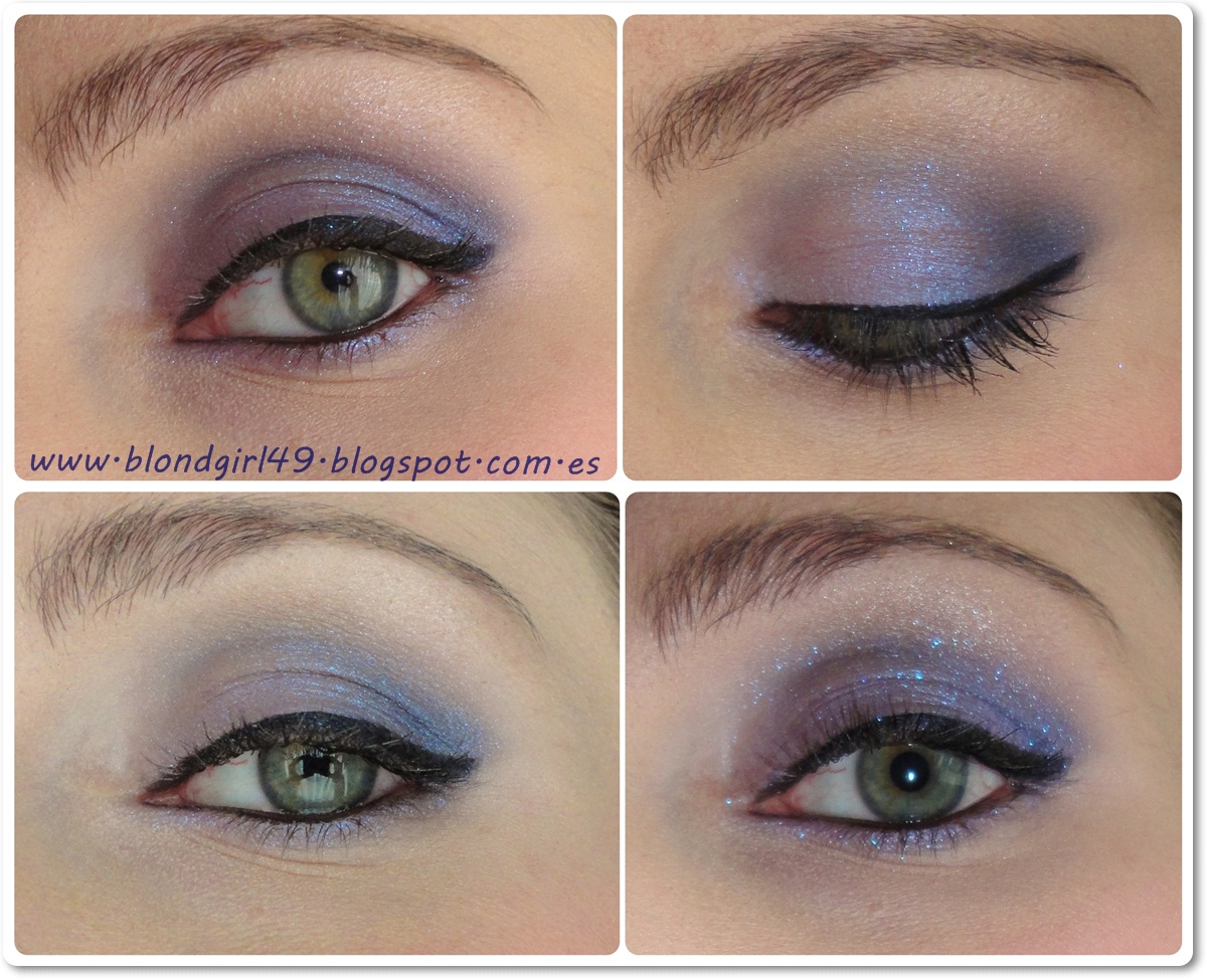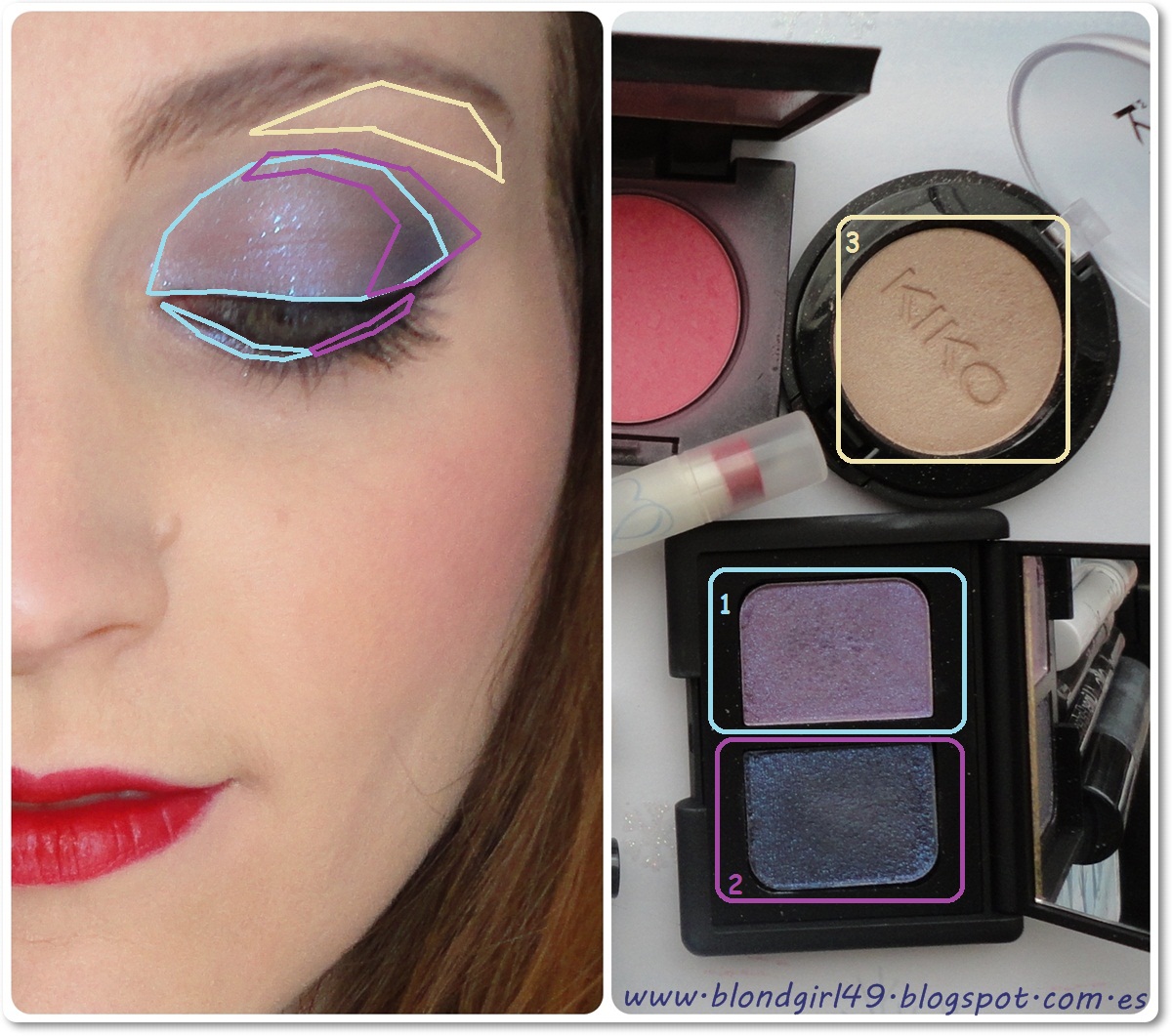 En los ojos:Primero aplico el jumbo por todo el párpado móvil para que queden más intensos los colores de las sombras y se adhiera bien todo el brillo que tiene. En el párpado móvil aplico la sombra moradita clara (1) y también en la parte del lagrimal y primera mitad de la parte inferior del ojo. Luego en la V externa aplico la que es azul oscura y la llevo hacia la cuenca del ojo para difuminarla bien con la moradita. También la aplico en la otra mitad de la parte inferior del ojo. En el arco de la ceja aplico la de Kiko que es un tono hueso irisado cuquísimo^^ (es la que más uso para este fin y la tengo como nueva de la poca cantidad que se necesita :D).Luego hago el delineado superior con el rotulador en negro, hago el delineado en la waterline con el lápiz de ojos negro de Yves Rocher y aplico la máscara de pestañas^^OJITO Y MEJILLA: