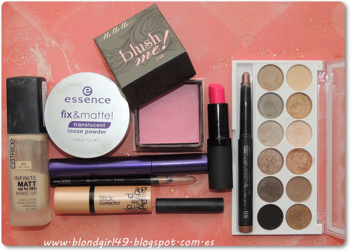 Rostro:- Stick corrector nº1 de Deliplus- Infinite matt up to 18h de Catrice (próximamente review)- Polvos translúcidos de Essence- Blush me! Pink de Mememe (os los enseñé en esta entrada en la que os cuento de dónde son)Ojos:- Long lasting nº5 de Kiko- Paleta Undress me too de MUA, sombras: naked, shy, lavish, obsessed- Lápiz de ojos negro de YR- Super colour nº1 de Kiko (color morado) (os lo enseñaré pronto en unas compras que hice en Kiko con el descuento del 30% de la Glamour)Labios:- Labial nº7 Hot magenta de MememeOJILLOS: