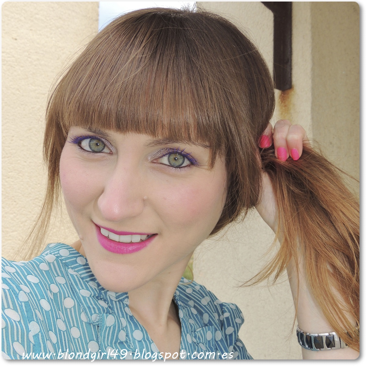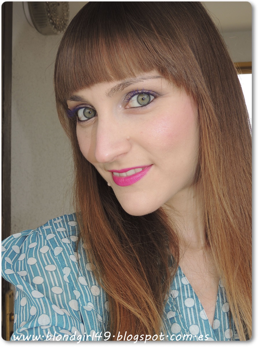 Para el resto de maquillaje podéis poneros los tonos que más os gusten, yo para los labios escogí un tono fucsia porque me gusta el contraste que hace con el color morado de las pestañas y en las mejillas opté por un colorete rosado muy discreto de color pero tiene un brillo muy bonito cuando le da el sol.