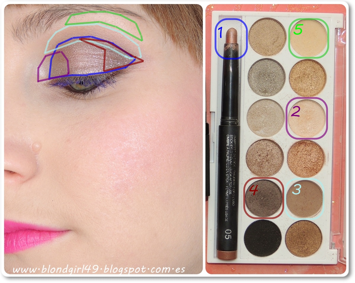 Primero he empezando aplicando el long lasting de Kiko, es un producto que me gusta muchísimo, es muy apañado para cuando tenemos prisa y los colores son todos preciosísimos pero también nos puede servir como prebase de sombras. Para aplicarlo me hago varias rayas seguidas como si me estuviera delineando el párpado superior y luego con un pincel sintético voy arrastrándolo por todo el párpado móvil (en la foto en color azul sale la zona que dejo con tono) siempre procuro que todas las zonas queden bien cubiertas y en un tono uniforme aunque ya de por sí deja el mismo tono. Luego cojo la sombra Shy que es un cremita irisado que suelo usar para iluminar y lo aplico en la zona del lagrimal del ojo extendiéndola por esa zona del párpado. Luego uso la sombra Lavish en la zona de la cuenca del ojo para que no se note tanto el corte de la sombra de kiko con nuestro tono de piel. Con la sombra Obsessed marco la V externa y un poco el final de la cuenca y difumino bien. Para acabar son las sombras ilumino el arco de la ceja con la sombra Naked. Ahora nos toca el detalle final de aplicarnos la máscara de pestañas, hay que repetir varias veces para que se note bien el color pero vale la pena y, por último, nos hacemos la raya negra en la waterline.FOTITOS: