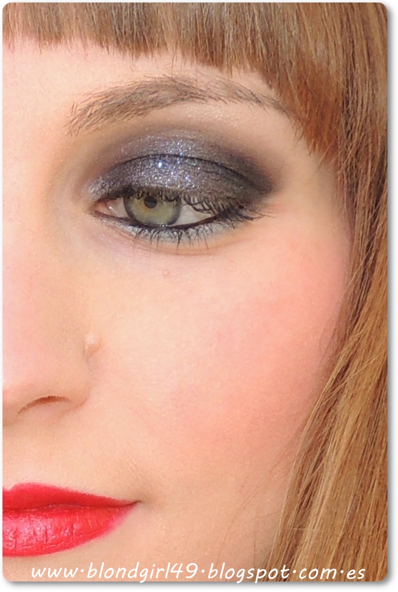 Primero he empezado aplicando como prebase en el párpado móvil el Pixie Epoxy de Fyrinnae (pronto os lo presento) que aguanta super bien los glitters que pueda llevar el pigmento y así evitamos que se nos caigan durante el proceso de maquillaje o durante la noche. La verdad es que hace su función super bien, viene a ser como el glitter glue. Hay que escamparlo/esparcirlo bien por el párpado para que quede una capa finita de producto sino quedarían pegotes al aplicar el pigmento. Una vez que está bien esparcido aplico el pigmento con pincel y a toquecitos por todo el párpado móvil. Luego miro de difuminar un poquito el corte con la sombra Lavish de la paleta Undress Me too de MUA que es de un marroncito mate y también aplicando un poco del pigmento (aunque pierde los brillitos y sólo deja el tono base). Luego en la V externa doy unos toquecitos con la sombra Corrupt de la misma paleta que es de color negro para que se vea un pelín más oscura. En el arco de la ceja llevo la sombra Shy que me parece preciosa para iluminar.Luego ya sólo he pintado la línea de agua con el lápiz de ojos negro, en la parte externa de las pestañas inferiores he delineado con el lápiz de ojos plateado de Yves Rocher y en las pestañas superiores he aplicado la máscara de pestañas de Clarins.MEDIO ROSTRO: