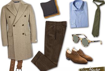 Empezaremos por el protagonista indiscutible, ese espectacular abrigo cruzado confeccionado en un paño de Lana, Angora y Seda, con bolsillos de parche con cartera y firmado por Ring Jacket. También de esta firma he elegido estos pantalones en 100% corduroy cotton, o lo que aquí llamamos pana de algodón. Lo sujetaremos a nuestra cintura con este cinturón en ante snuff de Loro Piana, a juego con estos Carmina brogueados.