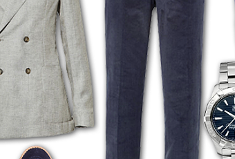Empezamos con la chaqueta cruzada en lino gris, con bolsillos tipo parche y botones de asta, firmada por AMI. Bajo ella encontramos una camisa de rayas azules y blancas, con cuello italiano y puño de botones, de Canali. Anudada al cuello tenemos esta corbata de motivos regulares y fondo granate en seda, de Drake´s London.