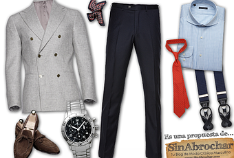 Comenzamos con la americana cruzada en pura lana color gris claro, que combinamos con el pantalón de vestir azul marino que presenta en su tejido raya diplomática, de corte slim y sin pinzas.