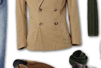 A diferencia del pantalón, la camisa es de un estilo mucho más formal, en tejido milrayas azul y blanco, con cuello cutaway, de Brioni. Restaremos formalidad con la corbata de crochet en un bonito color verde khaki. Firmada por Drake´s London.