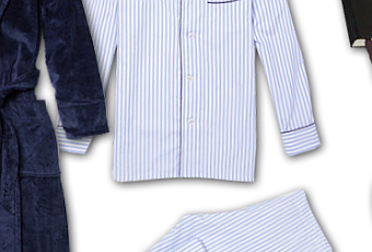 Turnbull & Asser no ofrece una serie de pijamas cómodos y la vez elegantes, el de hoy está confeccionado con un tejido de rayas celestes y blancas.