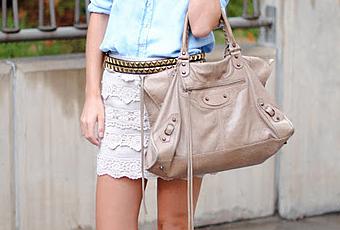 En el look de hoy queremos presentarles a Zina, una fashion blogger española, que tiene un estilazo y lo demuestra en cada uno de sus outfits. El look de hoy es casual, cómodo y muy primaveral: falda con aplicaciones de bordado en color nude, camisa denim, cinturón con aplicaciones doradas, botines beige y bolso Balenciaga a tono.