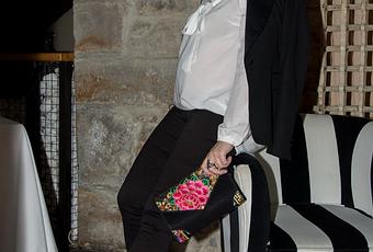 El look está compuesto por la camisa blanca premamá (de shopmami), pantalón premamá negro, americana negra, zapatos rosas y clutch negro y rosa.