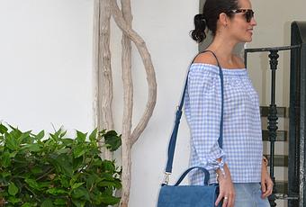 En este look intenté que todas las prendas estuvieran en armonía en tonos azules, y destacaran los botines camel con el detalle dorado. La blusa sigue dos tendencias: el de las prendas sin hombros y el estampado Vichy, ambas son de mis preferidas de la temporada. Además el tono de azul es de mis favoritos y lo han podido ver en muchos de mis looks, aquí o aquí.