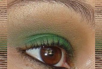 Extendí la sombra verde en el párpado, luego apliqué la sombra marrón y difuminé iluminé el arco de las cejas, maquillé la línea de agua con un tono negro y apliqué máscara de pestañas.