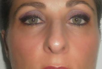 Eyeliner en pico (pin-up es la idea), en base lila más claro, en lagrimal gris, y dónde termina el eyeliner morado oscuro, debajo ceja sombra beigs