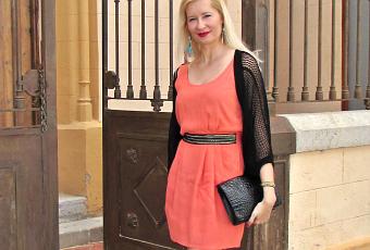 En este caso he escogido este sencillo vestido con color actual y tejido fresco sin mangas, que al tener unos detalles en negro y dorado en cintura y tirantes le dan un toque chic. Para complementar el vestido dándole mas sobriedad al conjunto me decantado por el negro para accesorios y chaqueta de rejilla con mangas de murciélago.