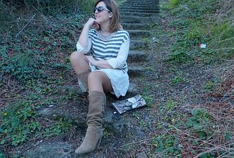 Una camisa/camiseta de rayas premamá/ embarazada perfecta para cualquier look. Está confeccionada en un tejido super cómodo y sienta genial. Por delante tiene rayas, y las mangas y la espalda en tono liso. Yo en esta ocasión la he combinado con falda de volantes y encaje en crudo y botas del mismo tono. Ya os enseñaré más combinaciones.