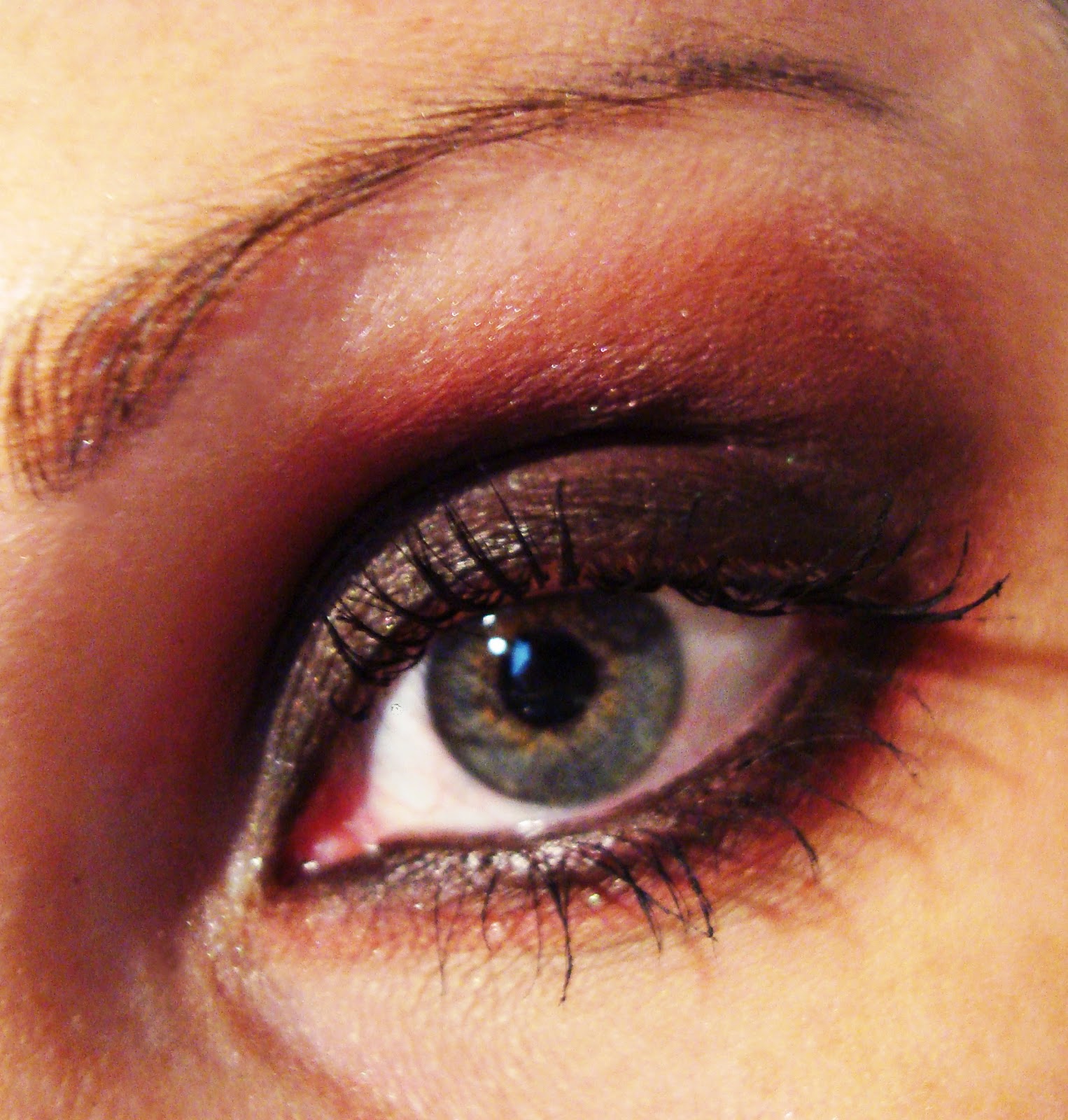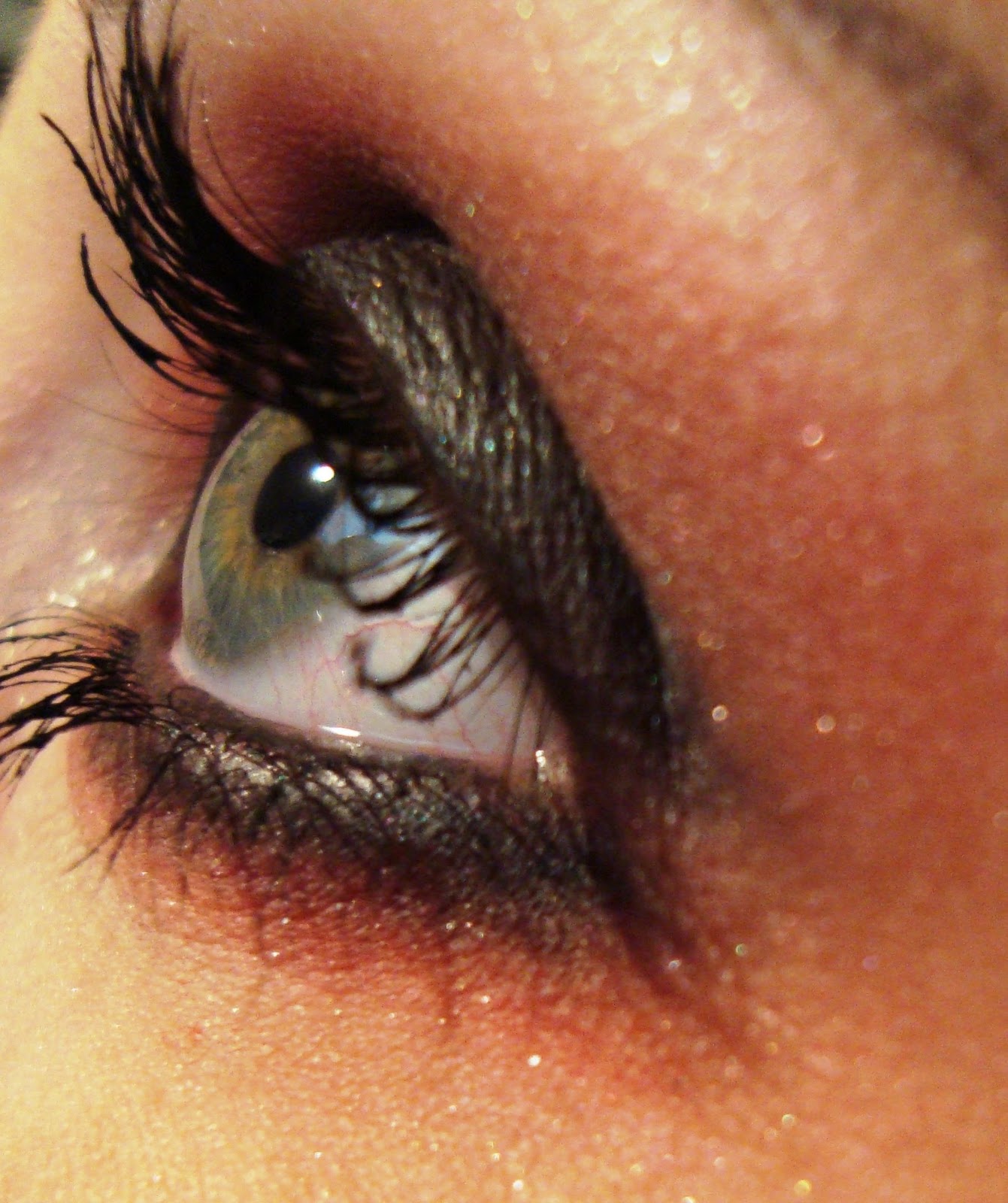 1. Con un lápiz negro, hacemos una linea en el párpado (la linea que todas nos hacemos cuando nos maquillamos. Pero esta vez habrá que hacerla más anchita de lo habitual. Luego Difumina la raya hasta cubrir el párpado (sólo el párpado movil).