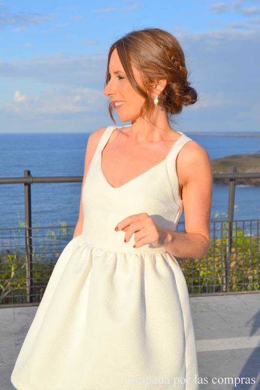 El blanco es el color del verano por excelencia, así que casi se que puede decir que un vestido blanco es prácticamente imprescindible en nuestro fondo de armario veraniego. En el post de hoy os enseño un look romántico con un vestido blanco que tengo desde hace tiempo y que es sin duda uno de mis favoritos, ya no sólo por el color, sino por el corte que tiene, el escote de la espalda...., es uno de esos vestidos que te lo pones y te sientes especial. Para este look lo he combinado con unas cuñas de esparto, pero encajaría perfectamente con una sandalia plana, un bolso étnico que aporta todo el colorido necesario al look y de complementos un brazalete y unos preciosos pendientes de cristales de swarovski y hechos a mano de de LOS SUEÑOS DE MI NIÑA. El toque más romántico lo aporta el peinado, las trenzas están arrasando este verano, así que para este look mi peluquera Verónica de SALÓN DE PELUQUERÍA PERRINO de Candás optó por hacerme un recogido con dos trenzas, un peinado perfecto para lucir con este vestido y además muy cómodo e ideal para los días de calor. Qué os parece el look? Bolso: KISSING ROOMPendientes: LOS SUEÑOS DE MI NIÑA Peinado: SALON DE PELUQUERIA PERRINO