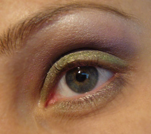 En el párpado móvil aplico el tono verde perla en lápiz exactamente el Jumbo de Nyx. En el pliegue, utilizo un tono morado que suavizo con otro tono rosado perla. También es el jumbo de Nyx. Este lo difumino mucho más. Y en el hueso, un tono rosa irisado. (Jumbo Nyx) Y justo debajo de la ceja un poco de blanco irisado para darle luz.
