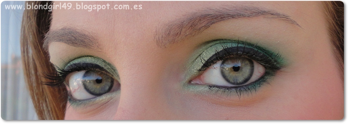 Rostro: Aplico la base de maquillaje de Catrice y la sello con los polvos compactos de skeyndor. Ojos: Primero aplico la sombrita verde matte (Cricket) por todo el párpado móvil, seguidamente con la verde mas oscurita (Dragon Fly) marco la V externa y la cuenca del ojo que difumino con el pincelito de difuminar. Luego de la otra paleta cojo un verdecito tirando a dorado con shimmers (Golden Silvers) y la pongo por la parte del lagrimal y el primer tercio del ojo, difuminándola con la verde que he usado como base. Para iluminar debajo del arco de la ceja he usado la sombrita blanca matte (Pow!). En la parte inferior del ojo he usado las sombras verde oscurita y la verde tirando a dorado.Me hago el delineado con el eyeliner en color negro de Rimmel London, la verdad es que esta marca no me mata demasiado pero lo que es el eyeliner y la máscara de pestañas me gustan muchísimo :).