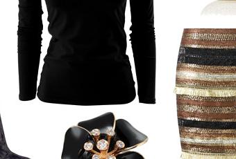 Este conjunto es algo mas caro. Como elemento central lleva una falda de Mango valorada en 72€. Luego juego con una camiseta negra, como elemento poco llamativo, unos botines que dan un aire mas juvenil con esos botones dorados en las esquina y para finalizar accesorios y un bolso dorados, a juego de la falda.