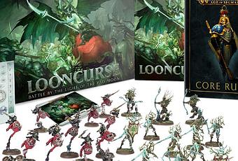 Sale Looncurse, una nueva caja en las que se enfrentarán Gloomspite Gitz contra Sylvaneth. Cada bando consta de dos figuras que, por ahora, solo se podrán conseguir con esta caja para liderarlas: Un Garrapato Gigante de las Cavernas por un lado y Archi-Aparecido por otro, que dirigirán sus fuerzas por el control de Ayadah.