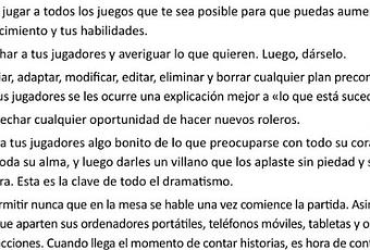 Esto son los suyos, sobre todo enfocados a los DMs, que ha subido hoy los de Webvampiro. Sinceramente, de este tipo de cosas suelo tener una cierta distancia. Mucha gente considera a John Wick un genio, otro un flipado. Para mi personalmente, hay cosas de las que habla con las que estoy conforme y con otras no tanto. Con estos "mandamientos roleros" estoy, eso si, mas que conforme con prácticamente todos. Algunos igual los matizaría pero ligeramente ("Robar buenas ideas y hacerlas tuyas"...prefiero mas adoptarlas, adaptarlas y mejorarlas si se puede).