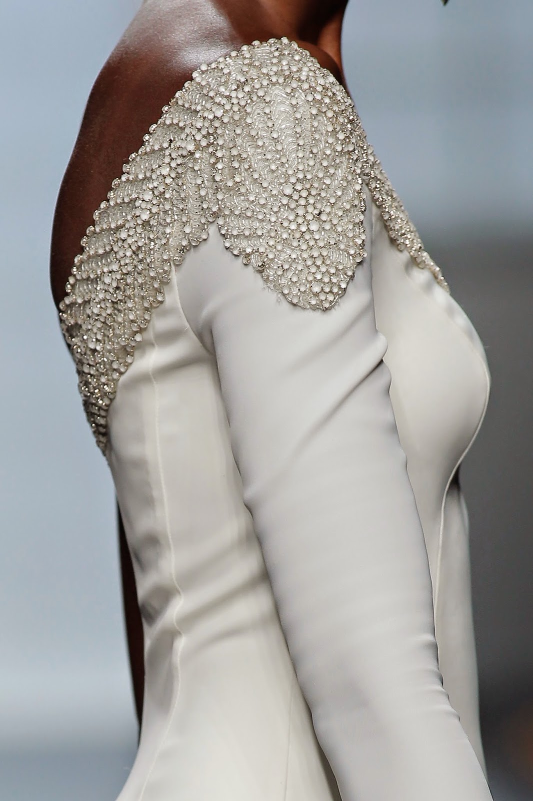 Lo hemos elegido por: TODO!!! El corte del vestido que hace una figura de mujer elegantísima. por la originalidad de sus tejidos vaporosos en mangas con caída como una capa corta superpuesta con cuello largo, por la riqueza del vestido todo bordado de pedrería (tendencia), por su abertura delantera de la falda del vestido (tendencia)