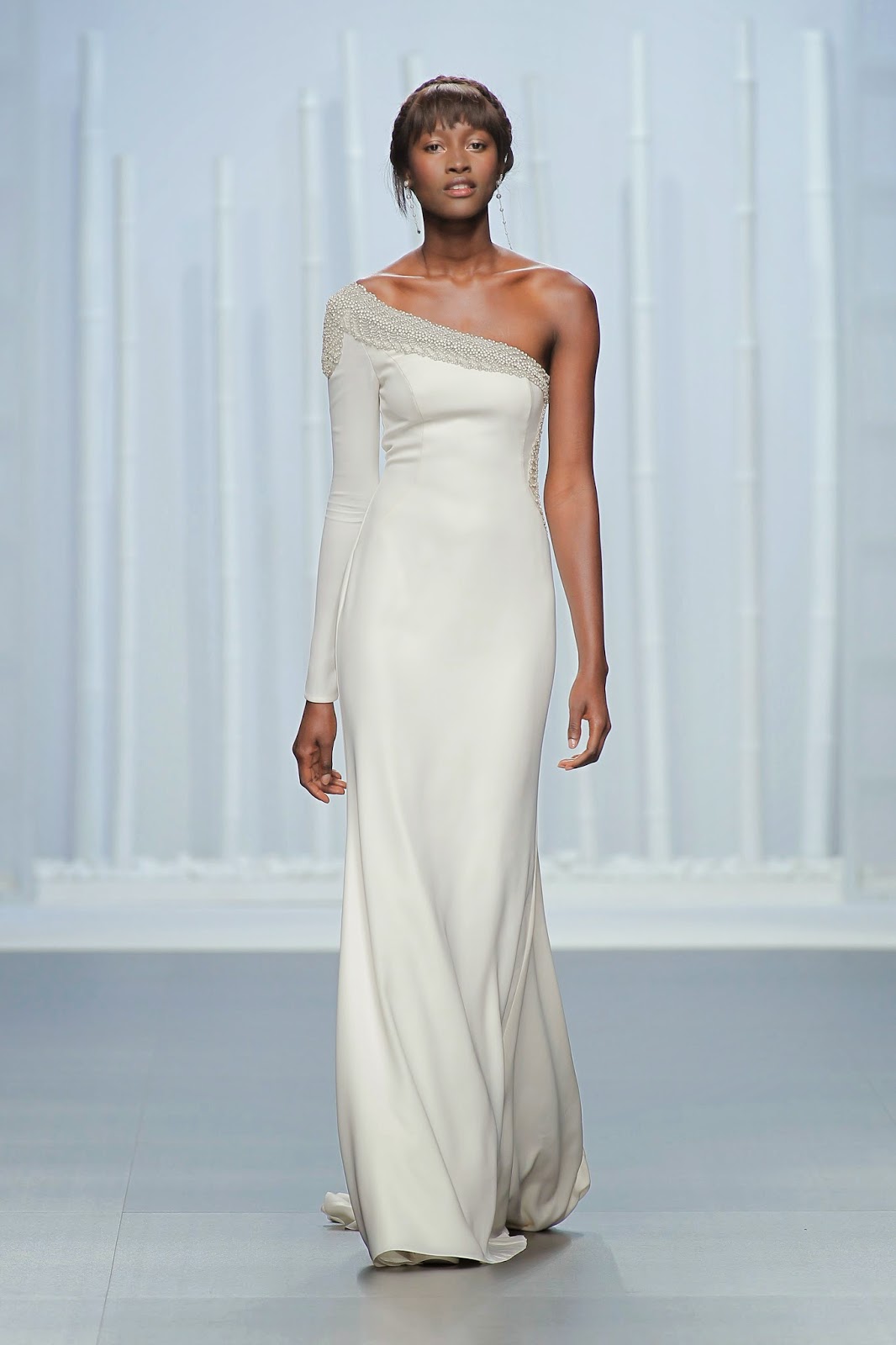 Lo hemos elegido por: ser un vestido de una sola manga (tendencia) que siempre estiliza a la novia, por su tejido vaporoso y corte que realza el cuerpo de la mujer, por su detalle de pedrería (tendencia) en escote, hombro, espalda y cintura, y por el detalles de los botoncitos interiores de la única manga del vestido. Para novias sofisticadas.