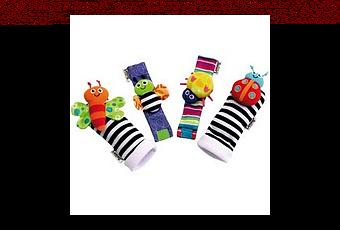 Los juguetes que se accionan a través del movimiento (pateando en la cuna o simplemente moviéndo la mano como los sonajeros convencionales) estimulan varios sentidos en el bebé, fundamentalmente el movimiento y ejercicio. Un ejemplo son estos sonajeeros, cuyas caras sonrientes estimulan la visión y el enfoque de la vista. La acción de estirarse para alcanzar los patucos despiertan los músculos del bebé. El suave cascabeleo crea agradables sonidos cuando el bebé se mueve.