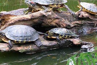 Esta pequeña tortuga con las manchas rojas a los lados de la cabeza (Trachemys scripta) fue muy vendida en los años 90 como mascota. Esta tortuga altera la estructura de la vegetación de los cauces, devora plantas, invertebrados, peces, anfibios, pequeños reptiles y mamíferos, e incluso puede atacar los huevos de aves que aniden cerca del agua.