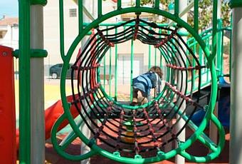 Una gran explanada de césped artificial con una estructura en el centro, su instalación principal, que es una estructura de túneles y pasadizos que simulan un hormiguero gigante, donde alrededor también dispone de otros columpios más clásicos para jugar.