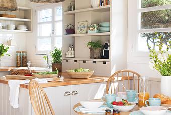 En madera clara¡Máxima calidez! Mobiliario, de Fusteria Catot. Encimera de haya listonada. Lámparas, en Maisons du Monde. Mesa y sillas, en India&Pacific. De Marta Prats.2 / 50
