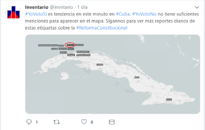 "#YoVotoSí es tendencia en este minuto en #Cuba. #YoVotoNo no tiene suficientes menciones para aparecer en el mapa. Sígannos para ver más reportes diarios de estas etiquetas sobre la #ReformaConstitucional"Desde esa cuenta @invntario (https://twitter.com/invntario) y otras, se gesta una maniobra mediática, que no es fruto de una mente brillante, sino de un equipo que casualmente ha surgido después de que Estados Unidos creara una Fuerza de tarea (Task Force) para Internet en Cuba.