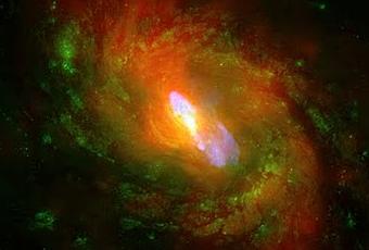 Imagen en longitudes de onda múltiplede de M77 (NGC 1068), que combina datos visibles (verde) del Telescopio Espacial Hubble con datos de radio (azul) de las parábolas del Very Large Array, en Nuevo México, Estados Unidos y observaciones de rayos X (rojo) del Observatorio Espacial Chandra. Los datos de radio revelan en realidad que los vientos tienen forma de un modesto chorro, mientras que las nubes de gas de rojo resplandeciente rodean el núcleo. Imagen: NASA / CXC / MIT / C Cañizares / D Evans et al / STScI / NSF / NRAO / VLA.