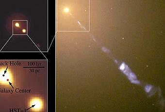 En la imagen del Telescopio Espacial Hubble vemos la galaxia elípitica M87. A la izquierda vemos dos agujeros negros en su interior. Un agujero negro supermasivo emite un potente chorro de partículas que puede verse en la imagen. Crédito: NASAUn grupo de astronomos en el Instituto de Tecnología de Florida, el Instituto de Tecnología de Rochester (RIT) en Nueva York y la Universidad de Sussex en el Reino Unido han descubierto que el agujero negro supermasivo en el centro de M87, la galaxia más masiva de las cercanas a la Tierra, no está donde se esperaba. La investigación, llevada a cabo mediante el Telescopio Espacial Hubble (HST), concluye que el agujero negro de M87 está desplazado del centro de la galaxia.