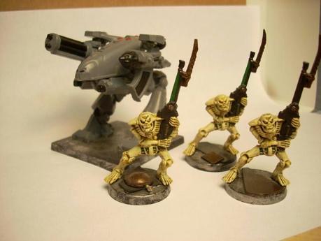 Estos son los de escala épica,6 mm.Pero estas figuras hicieron su aparición como figuras de 25-28 mm no en W40K,si no en el Cruzada Estelar de MB como parte de los enemigos de los marines espaciales del juego.Creo que en alguna WD se les dieron unas regla para usarlos en el RT,pero no estoy seguro(Me han comentado que fue en la WD 143 UK).Cuando llego 2ª edición,se tomo este concepto de los Androides del Caos y se re-interpreto entero.