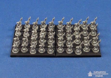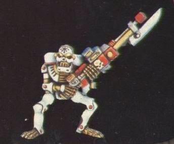 Estos son los de escala épica,6 mm.Pero estas figuras hicieron su aparición como figuras de 25-28 mm no en W40K,si no en el Cruzada Estelar de MB como parte de los enemigos de los marines espaciales del juego.Creo que en alguna WD se les dieron unas regla para usarlos en el RT,pero no estoy seguro(Me han comentado que fue en la WD 143 UK).Cuando llego 2ª edición,se tomo este concepto de los Androides del Caos y se re-interpreto entero.