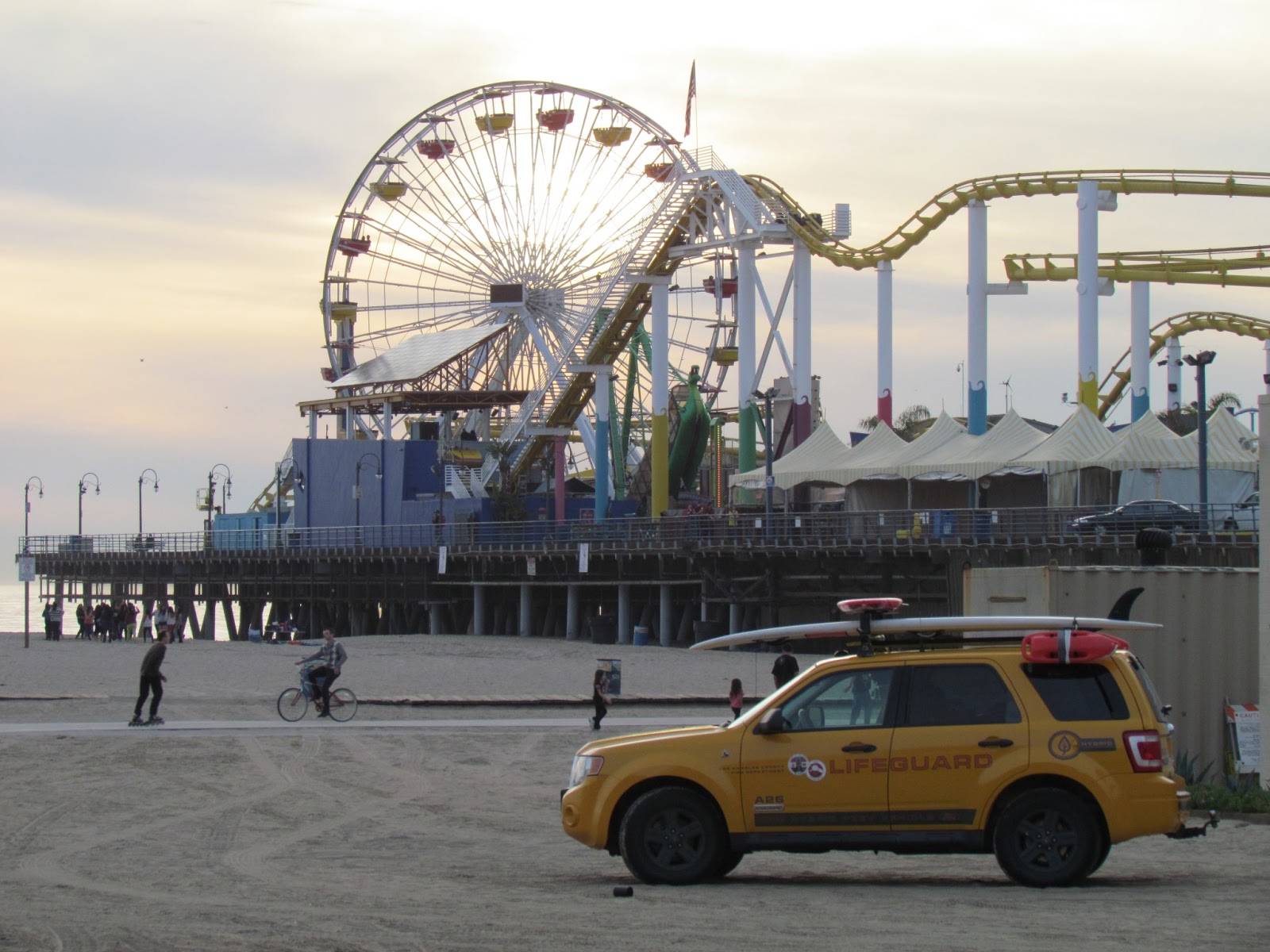 Una de las últimas paradas en este recorrido por la ciudad de Los Angeles fue en la famosa Playa de Santa Mónica, y su no menos famoso Muelle de Santa Mónica. Para no perder la costumbre en LA tuvimos que pagar por dejar aparcado el coche en la playa, pero al menos lo dejamos al pie del muelle. Sin duda Santa Mónica es una de las mejores playas de Los Angeles junto a la de Venice Beach, ancha, larga, limpia, de arena fina, pasear por la orilla es un verdadero placer y un lugar formidable donde poder contemplar los hermosos atardeceres del Pacífico. Y cómo no, es hacer un viaje al pasado, a un pasado televisivo que... ¿quién no conoce? Paseando por la orilla esperábamos ver aparecer en cualquier momento a Pamela Anderson en su papel de vigilante de la playa, corriendo a salvar a algún incauto que parecía ahogarse, quizás a propósito, con el objeto de ser salvado con sus grandes flotadores, esos de color rojo, de plástico y con una cuerda con arnés atada...¿Qué habíais pensado? Parece mentira pero la serie "Baywach", o "Los vigilantes de la playa" como se la conocía en España, figura en el libro Guinness de los records como la serie televisiva más vista de todos los tiempos.