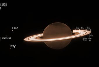 Esta nueva imagen de Saturno muestra claramente detalles dentro del sistema de anillos del planeta, junto con varias de las lunas del planeta: Dione, Encelado y Tetis. Las exposiciones adicionales más profundas (que no se muestran aquí) permitirán al equipo sondear algunos de los anillos más débiles del planeta, no visibles en esta imagen, incluido el delgado anillo G y el anillo E difuso. Los anillos de Saturno están formados por una serie de fragmentos rocosos y helados: las partículas varían en tamaño desde más pequeñas que un grano de arena hasta unas pocas tan grandes como las montañas de la Tierra. Los investigadores utilizaron recientemente Webb para explorar Encelado, y encontraron un gran penacho que sale del polo sur de la luna que contiene partículas y abundantes cantidades de vapor de agua: este penacho alimenta el anillo E de Saturno.