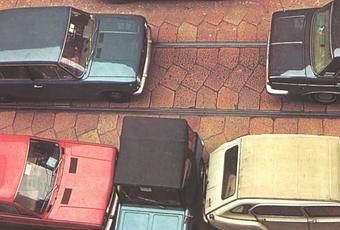 Auto urbano experimental de Fiat estacionado entre un Fiat 130 y un Fiat 132.