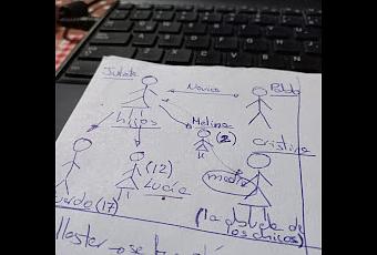Divido una hoja blanca en unos ocho sectores con forma de cuadrado, y dejo allí constancia de los personajes, algunas de sus características, las relaciones entre ellos. Anoto datos geográficos, históricos. Me hago una línea temporal, si lo creo necesario, en la que sitúo ciertas escenas importantes, sobre todo cuando decido contar la historia de manera fragmentada (muy fragmentada a veces).