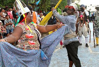 La vestimenta de los bailarines congos es una parte integral de esta tradición. Los hombres visten trajes elaborados con telas coloridas y brillantes, decorados con motivos africanos y caribeños. Los sombreros con adornos de plumas, las capas de terciopelo y los accesorios ornamentados completan su atuendo, creando un espectáculo visual deslumbrante.
