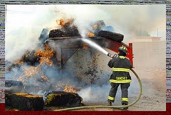 Los bomberos trabajan en extinguir un incendio que se ha declarado hoy a las 15.55 horas en una nave que almacenaba pacas de paja en el término municipal de Agudo (Ciudad Real), situada en el punto kilométrico 180 de la carretera N-502.