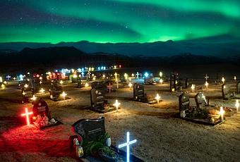 Suele haber asociadas algunas tradiciones curiosas a los cementerios islandeses. La mas conocida es la de iluminarlos por las las noches en Navidad con velas y actuales con cruces de LEDs y otros adornos luminosos. Es la forma que tienen los islandeses de acordarse de sus seres queridos que ya no están con ellos en las las fiestas navideñas y suelen formar un espectáculo llamativo en las oscuras noches. Generalmente, ademas, suele haber en el centro del cementerio una gran cruz luminosa, que esta encendida todo el invierno. Ademas de hacer bonito, es practico, ya que en las noches de tormentas de nieve dan un buen punto de referencia.A veces estas luces se mantienen hasta el festival de Þorrablót.Aquí hay una galería muy bonita.