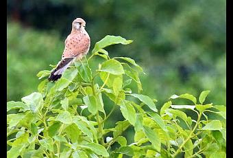05-11-2024. A la pareja de cernícalos de la torre del pueblo le encanta campear frente al balcón. Ahí está esta tarde el macho, en la copa de un aguacatero. Traen aquí también a los pollos recién volados y pasan el verano, entre cernidos y un griterío de llamadas de ceba, enseñándoles a detectar y picar sobre las presas.
