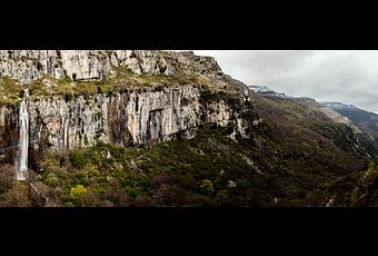 En la fotografía de ejemplo, con un diafragma 8, el punto de enfoque está en la parte central del muro de la cascada. Así me aseguro el foco desde la caída de agua hasta el fondo montañoso. Y paso al enfoque manual para que no varíe ni un ápice en las cinco fotografías que formarán la futura panorámica.