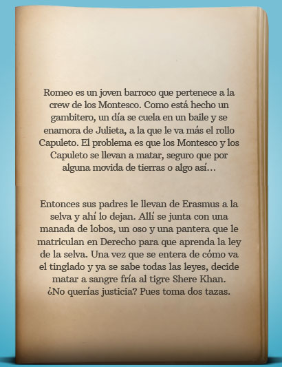 Entonces, le dáis a sinopsis y... voilà: un clásico disparatado. Además, las sinopsis tienen un toque humorístico de esos que tanto me gustan. ¿Cómo sería la de Romeo de la Selva? Según la curiosa web, algo así: