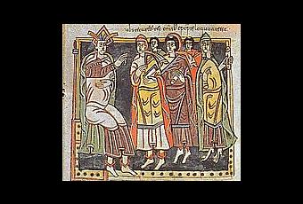 Recaredo y Obispos. Concilio III de Toledo, año 589. Códice Vigilano, fol. 145, Biblioteca de El Escorial.